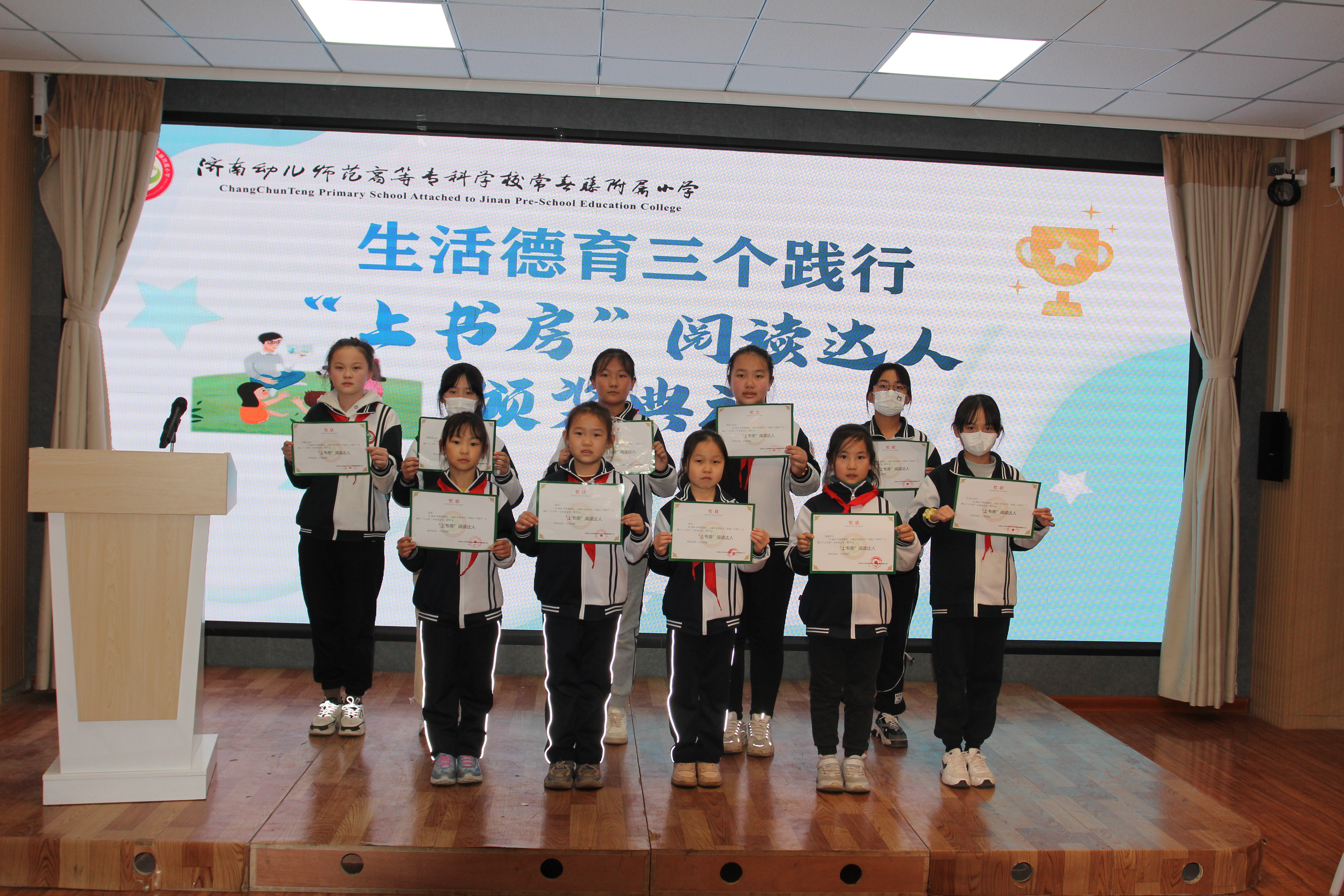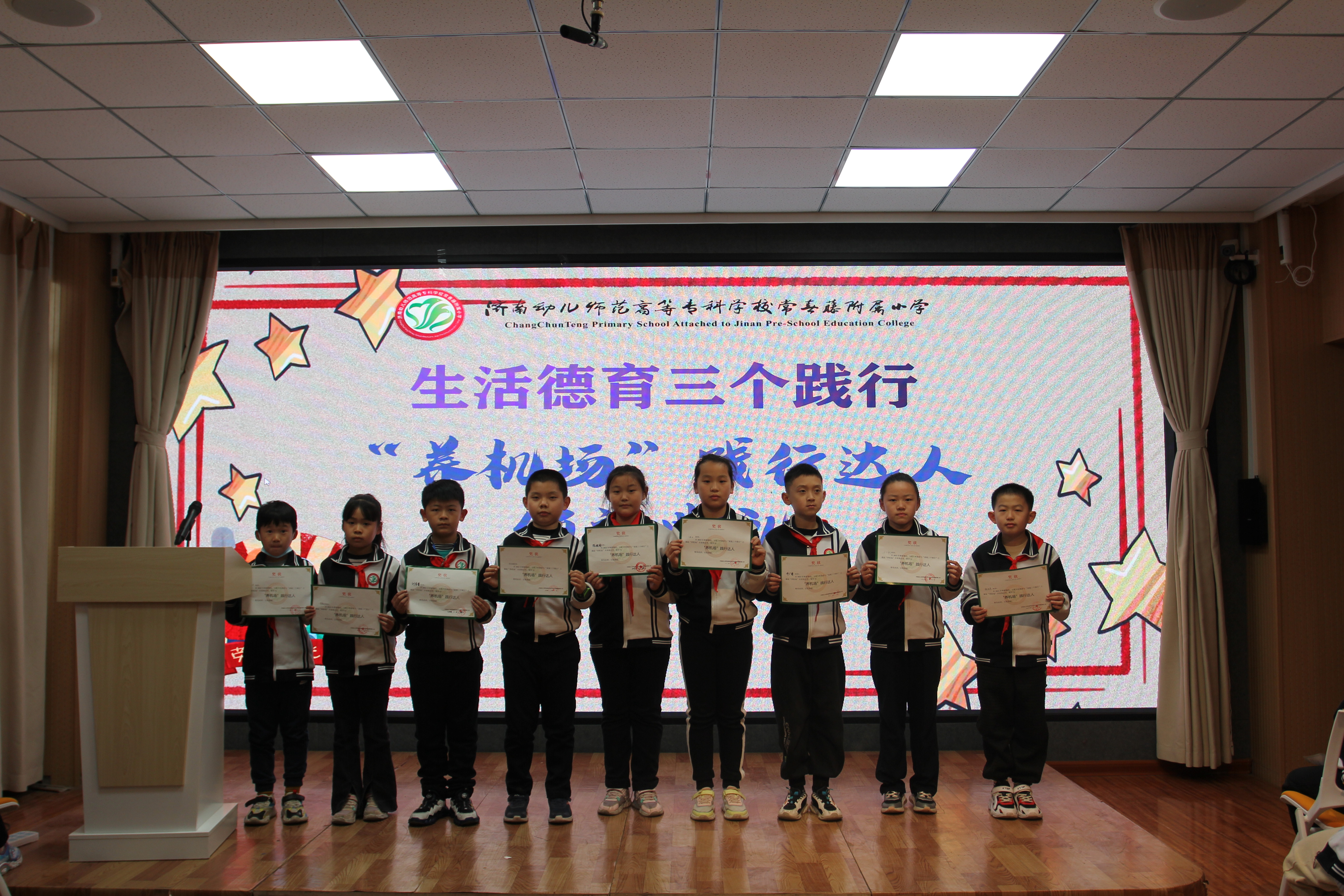 寒假期间,济南济南幼儿师范高等专科学校常春藤附属小学各班级广泛动员深入推动生活德育“家庭三个践行”行动实施,每一个家庭建起“养机场”、力行“众厨芳”、潜心“上书房”,为增进家庭幸福和谐,促进家校关系,营造生活德育环境提供了有效的途径。升旗仪式上,学校三(1)中队在班主任范升月老师的带领下,将假期活动开展的点滴成果进行了集中展示,并再次向学生家庭发出倡议。 生活德育“家庭三个践行”,是市教育局通过学生,让学生与家长共同参与的一项引领家庭生活有所改变的行动。 生活德育主张“在生活中、为了生活和高于生活”,不要说教,重在行动,通过行动后的体验,获得生活上的更大变化,“过什么样的生活,就是什么样的教育。”德育,只有更好地触及到了学生的家庭,触碰了真实的生活,并有所改变,这样的德育才更有根基,更有力量。接下来,我校将继续深入推进生活德育“家庭三个践行”行动,深挖活动内涵、宣传榜样示范、凝聚家校合力,共同培育学生的全面发展和健康成才!  春草学堂为各班代表颁奖: