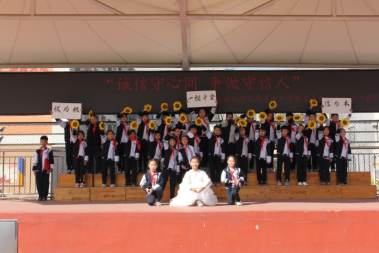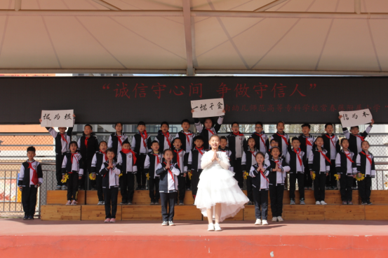 “诚为根,信为本,做人讲诚信,一诺千金。诚为根,信为本,我们树诚信,铭记于心。"同学们悦耳的歌声伴随着翩翩的舞步,整齐优美的动作,声情并茂,在思想上给师生们烙下了深深地诚信印记。诚信,是一言既出驷马难追的君子胸怀;诚信,是受人之托忠人之事的坦荡风度。愿同学们扬起诚信之帆,树文明大旗,创和谐校园,希望常春藤附小所有学子都能成为讲诚信的好少年。