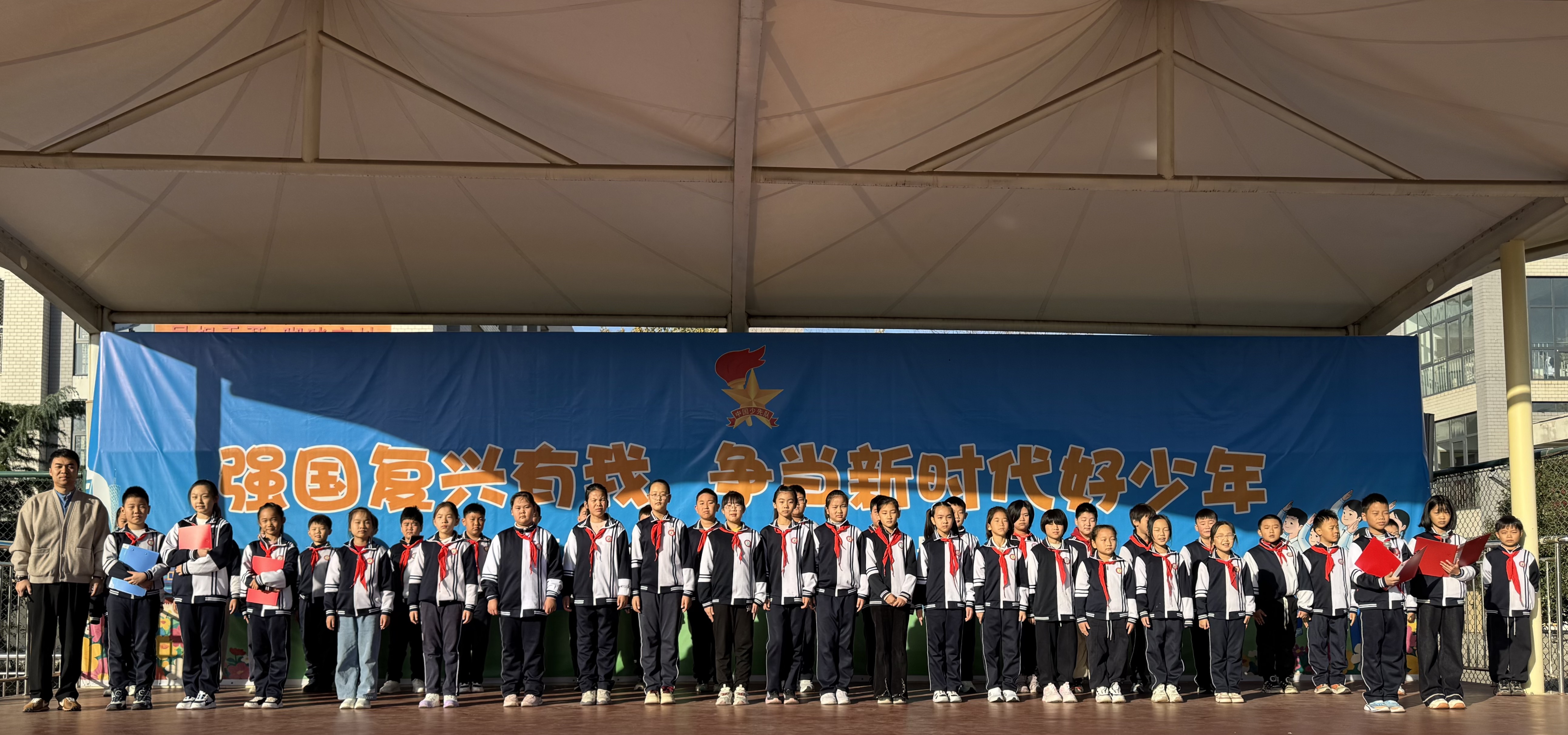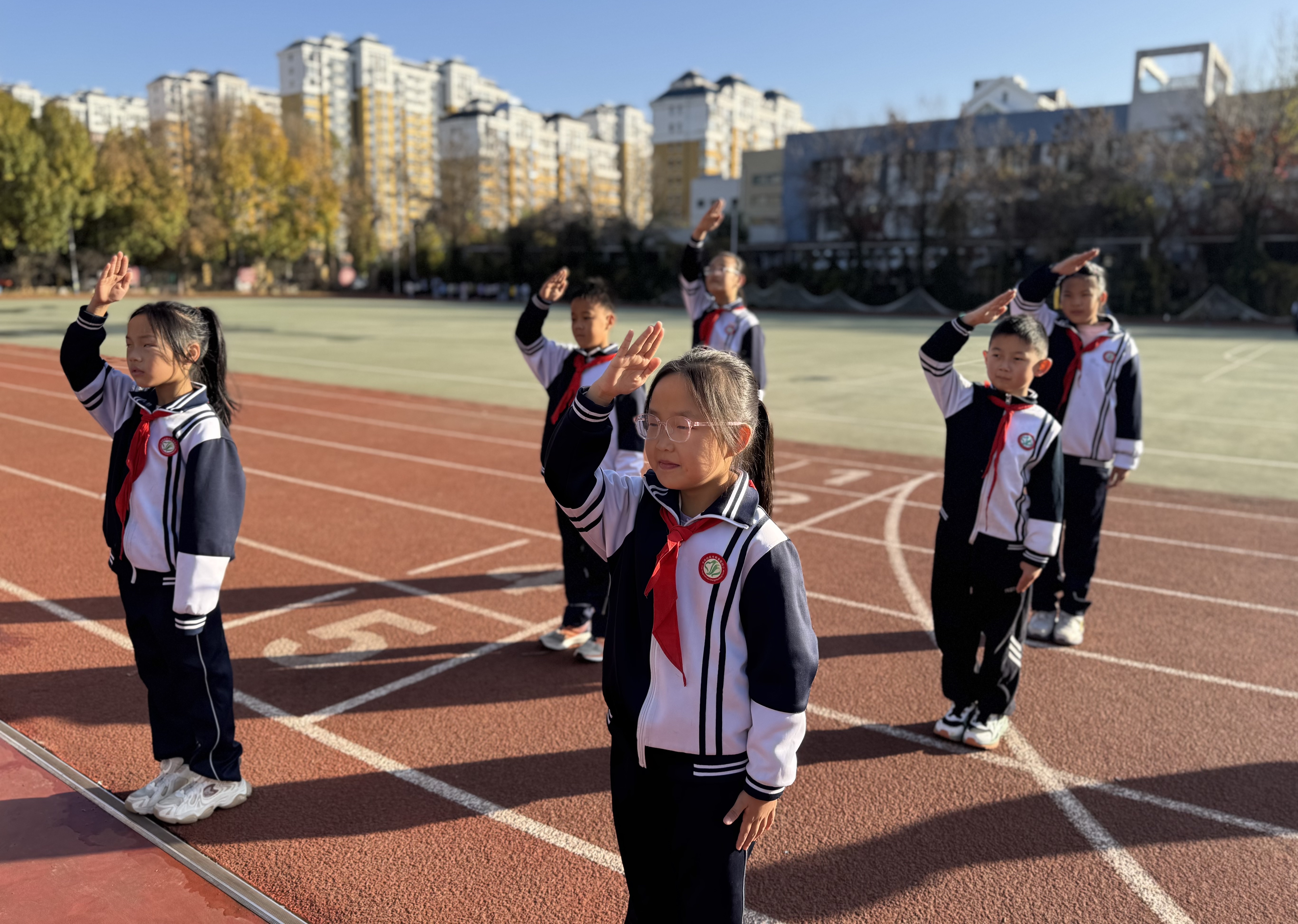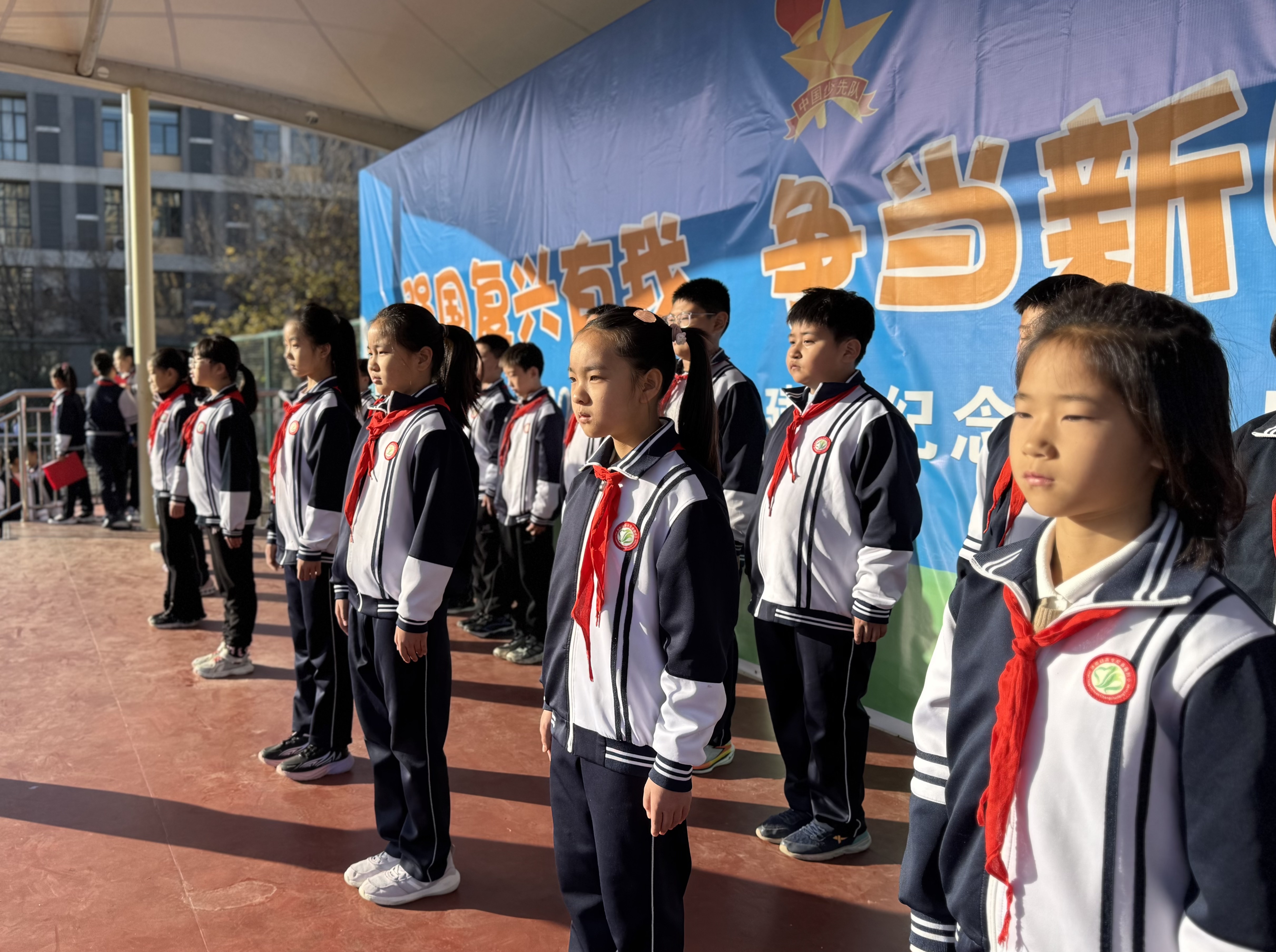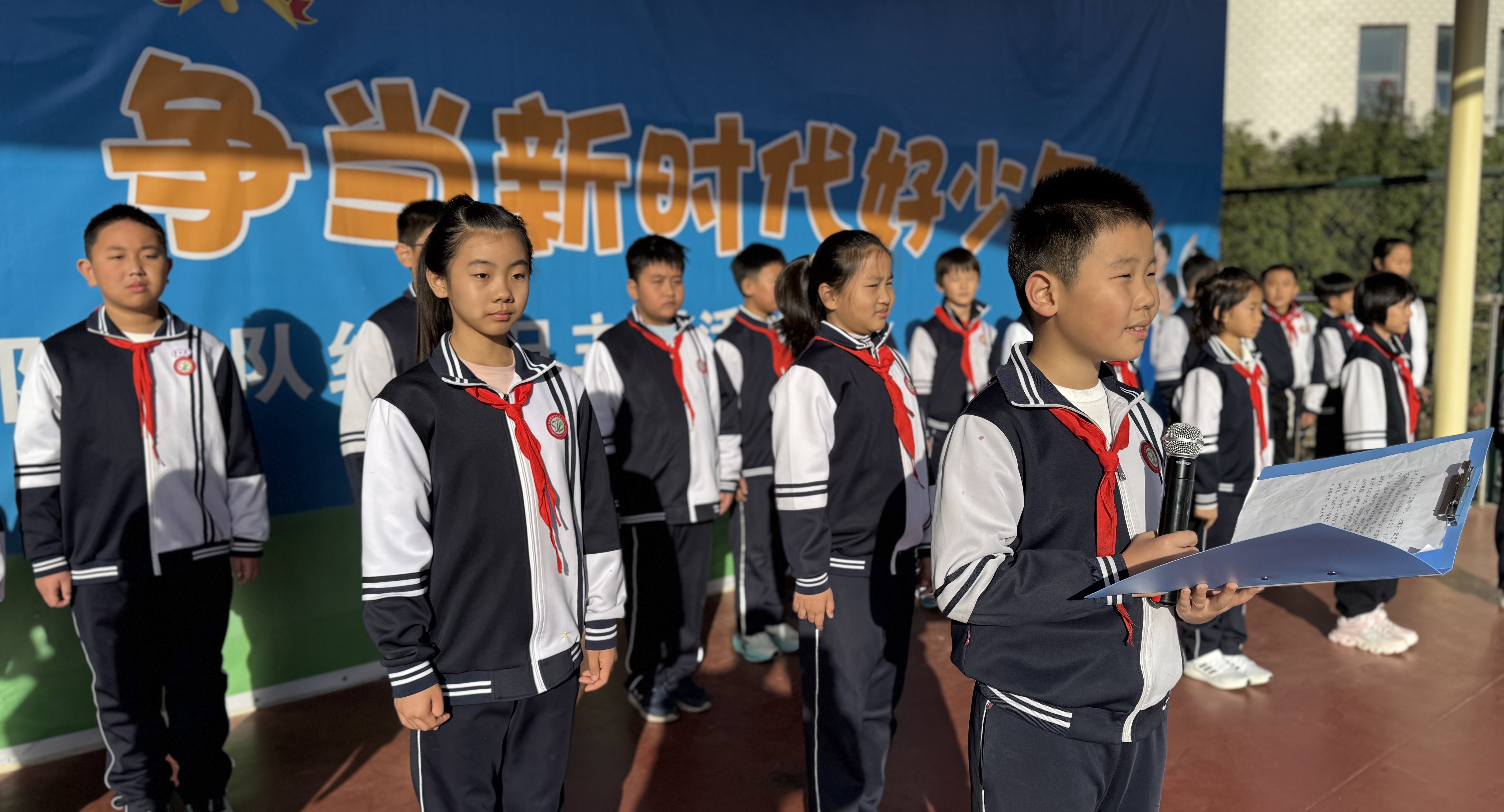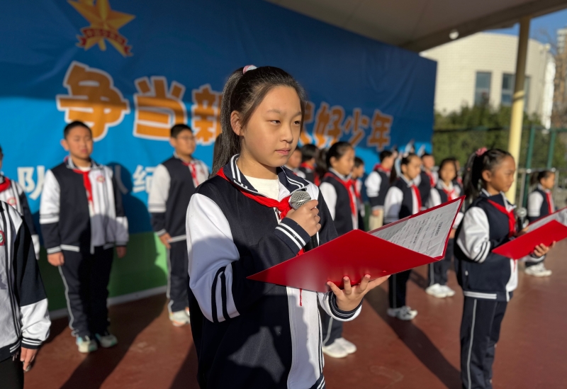 2025年11月10日清晨,济南幼儿师范高等专科学校常春藤附属小学全体师生齐聚操场,在朝阳与霞光的映照下,隆重举行“弘扬集体主义,团结在我身边”主题升旗仪式。本次仪式由四年级(2)中队承办,两位主持人精神饱满、声音洪亮,为校园注入了蓬勃向上的力量。  升旗仪式准时开始。出旗曲奏响,护旗手步伐铿锵;鲜艳的五星红旗冉冉升起,全体师生行注目礼,少先队员高举右手,齐唱国歌,嘹亮的歌声回荡在校园上空。  四(2)中队的赵一诺同学带来国旗下讲话《团结就是力量》。他用运动会上的呐喊、课堂上的互助、打扫时的分工三个鲜活场景,告诉同学们:团结不是口号,而是“你递给我的一支笔、我讲给你的一道题、我们一起擦净的那块玻璃”。朴实的话语引发了全场共鸣,掌声经久不息。  四(2)中队全体队员登台朗诵原创诗歌《这,就是团结》。“当千万颗星星汇聚成银河,当千万滴水珠欢笑着汇入江河……”孩子们用清澈的童声、渐强的节奏,把“星星汇银河、水滴汇海洋”的画面演绎得震撼人心。最后一声“团结奋进,乘风破浪”的齐诵,将气氛推向高潮,操场上空仿佛升腾起一股温暖而坚定的力量。