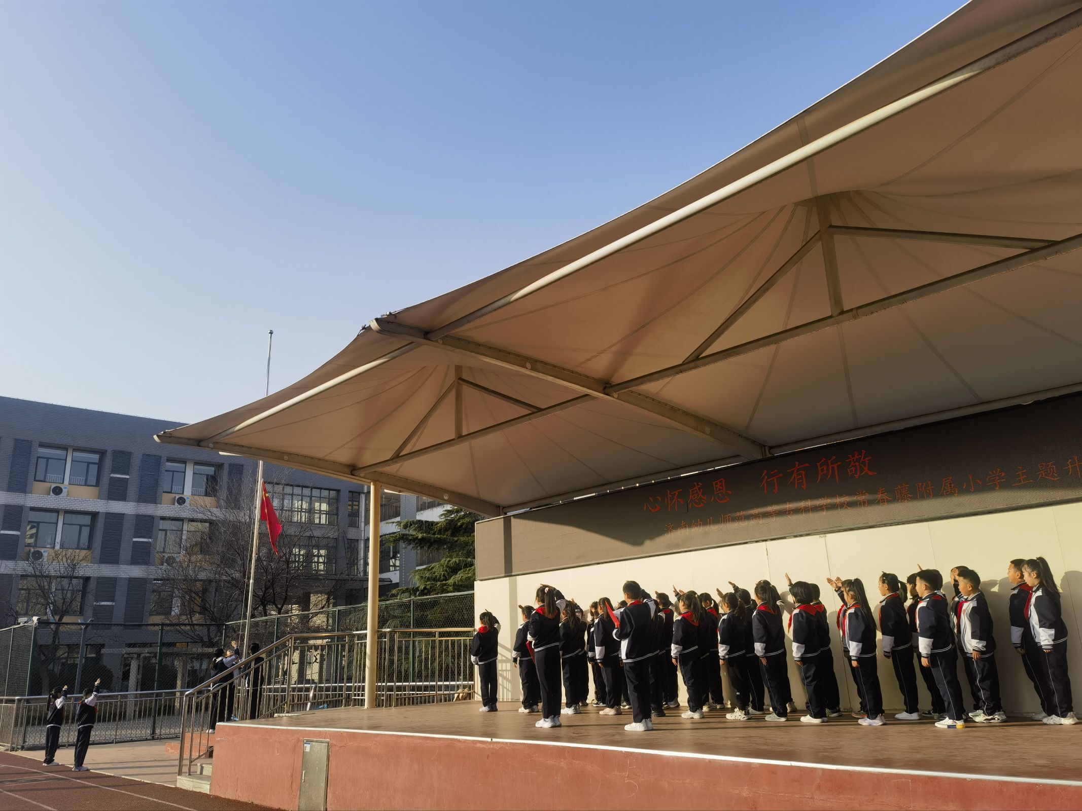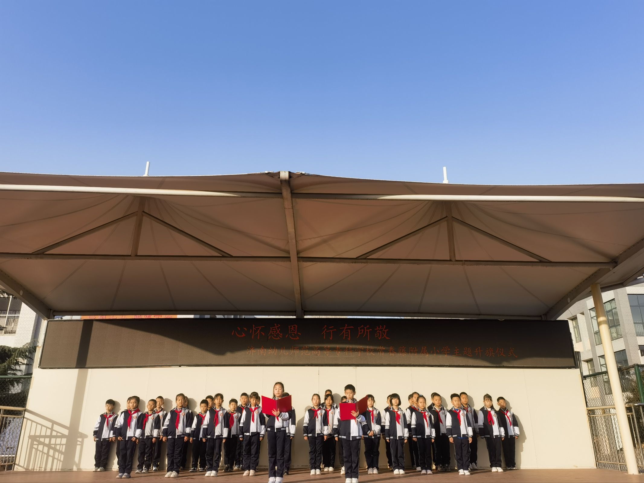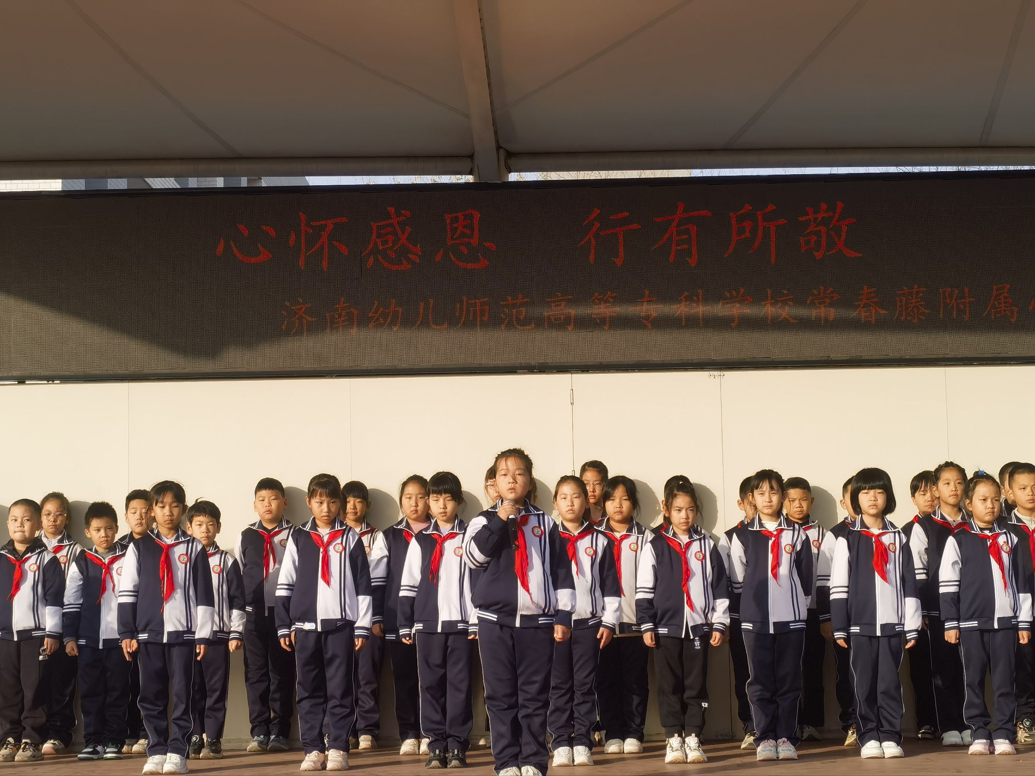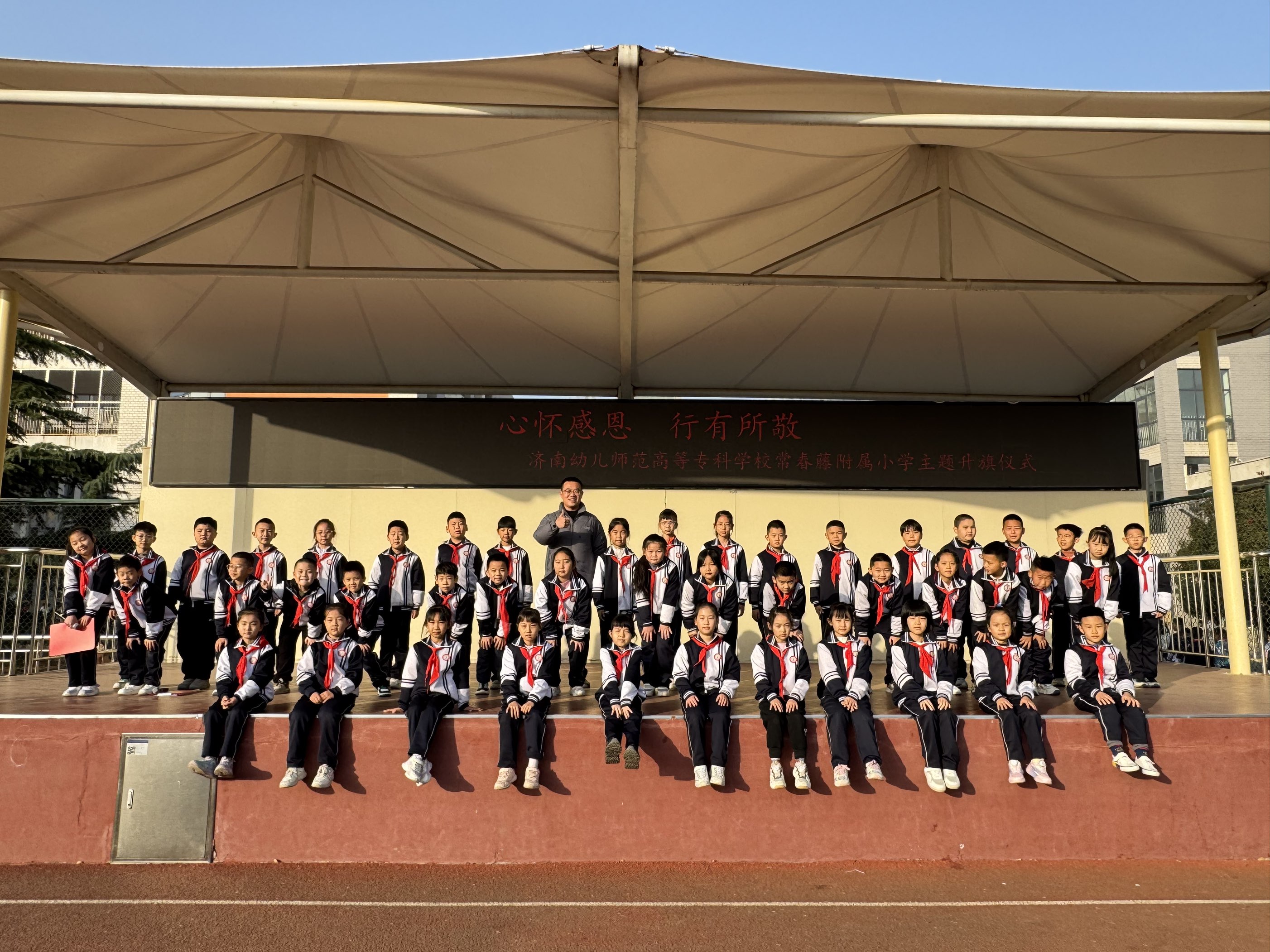 2025年11月24日清晨,暖阳洒满操场,济南幼儿师范高等专科学校常春藤附属小学全体师生齐聚操场,参加由三(6)中队主持的“心怀感恩,行有所敬”主题升旗仪式。