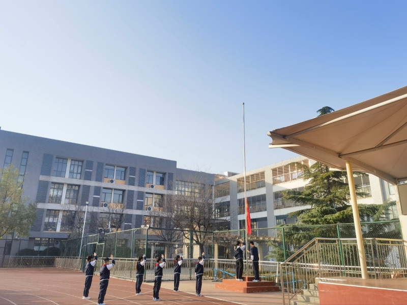护旗队员迈着整齐有力的步伐护送国旗入场。伴随着雄壮的《义勇军进行曲》,五星红旗冉冉升起,全体少先队员行队礼,师生齐唱国歌,歌声嘹亮,响彻校园。