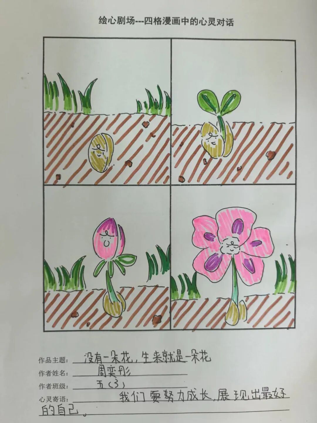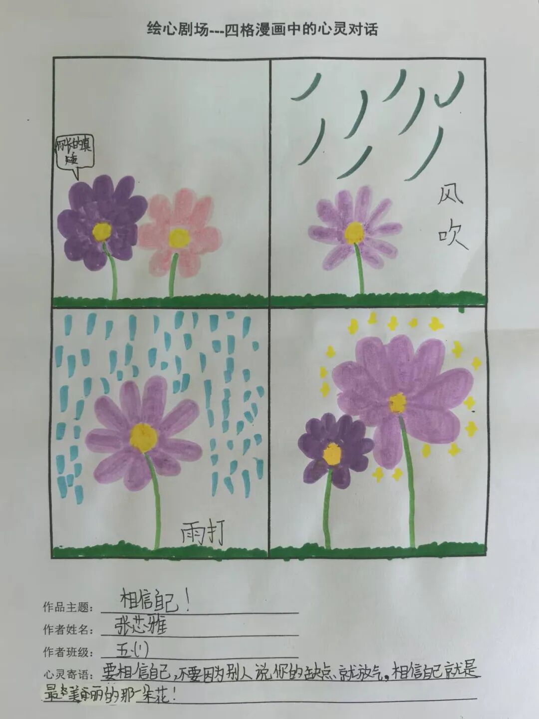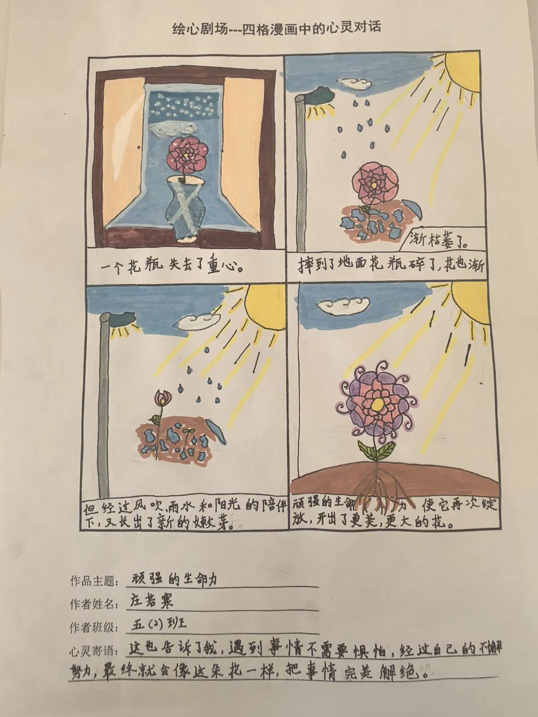 五年级同学们拿起画笔,创作“心理四宫格漫画”。 漫画成为同学们倾诉心声的窗口,他们用画笔描绘内心的情绪与烦恼以及对未来的憧憬。