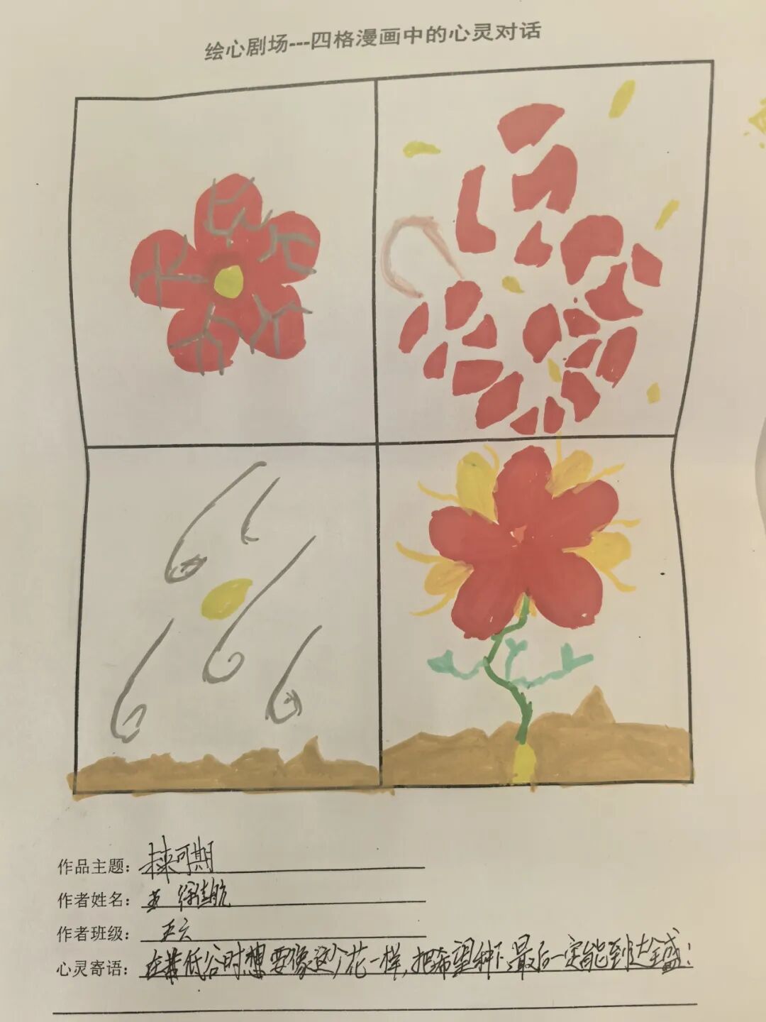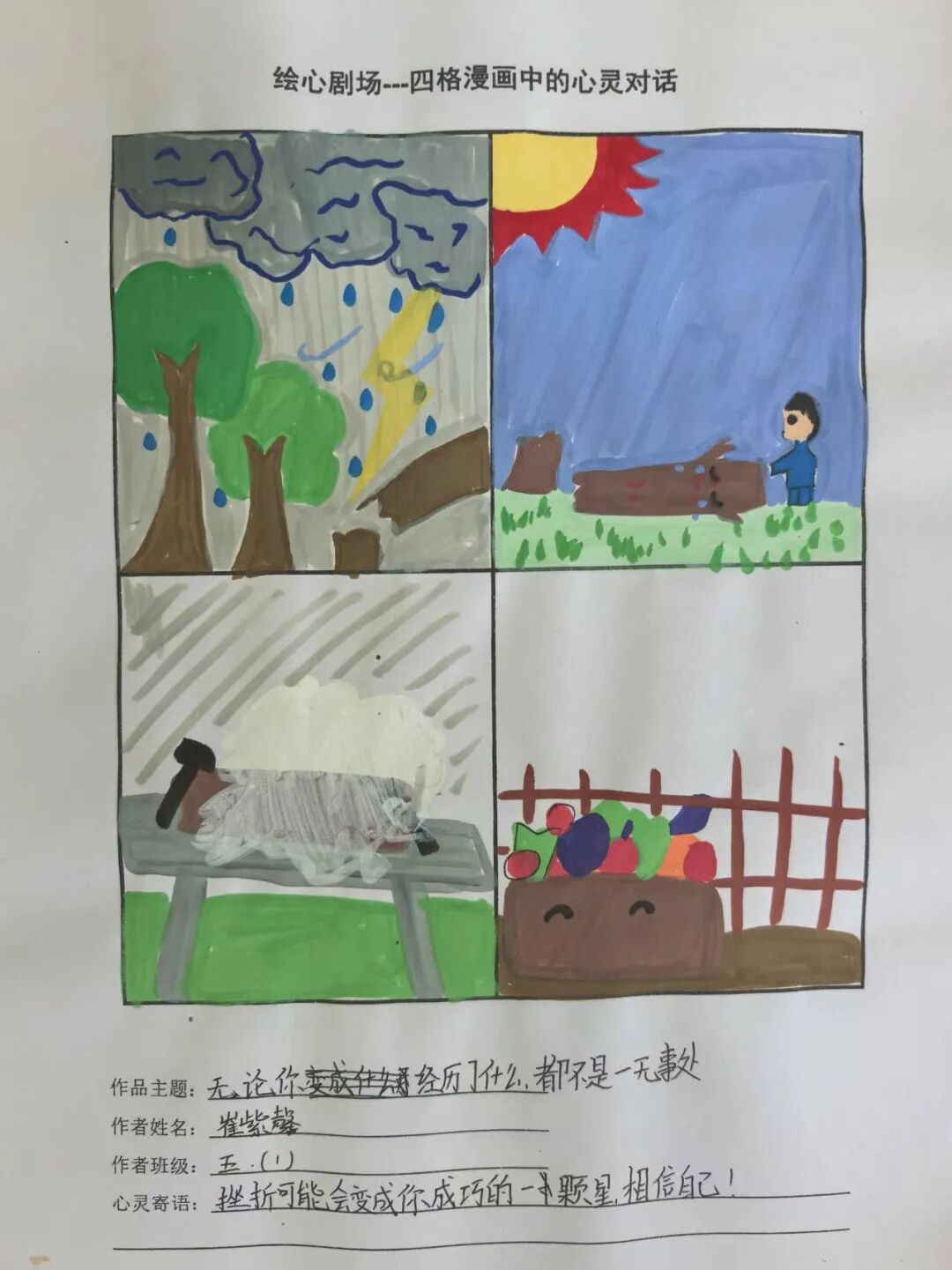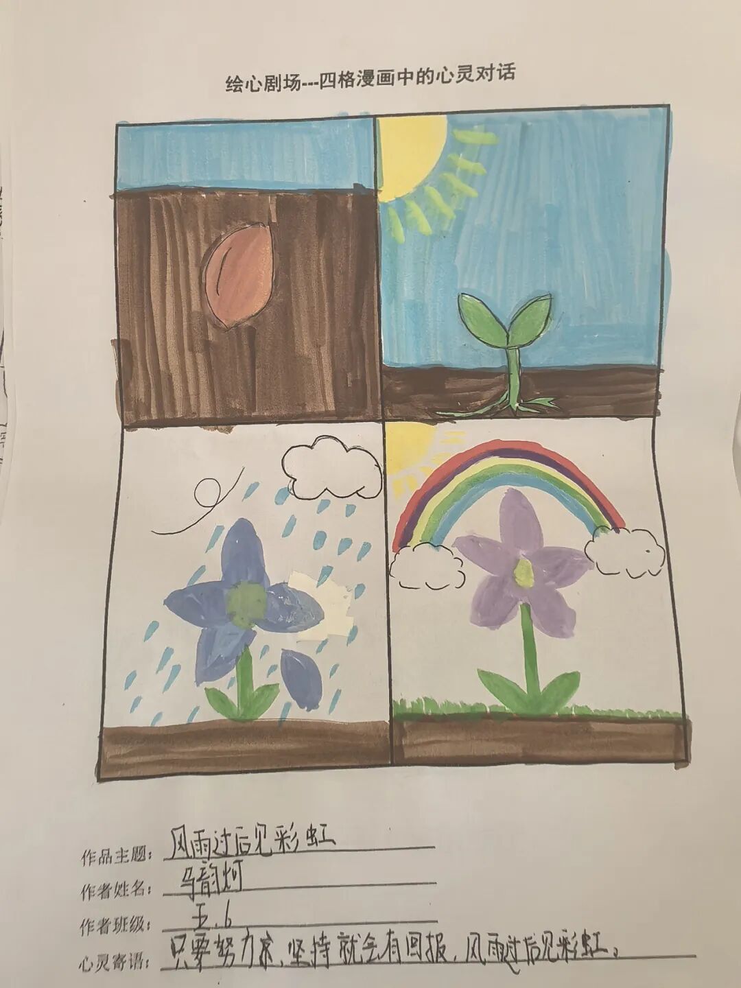 五年级同学们拿起画笔,创作“心理四宫格漫画”。 漫画成为同学们倾诉心声的窗口,他们用画笔描绘内心的情绪与烦恼以及对未来的憧憬。